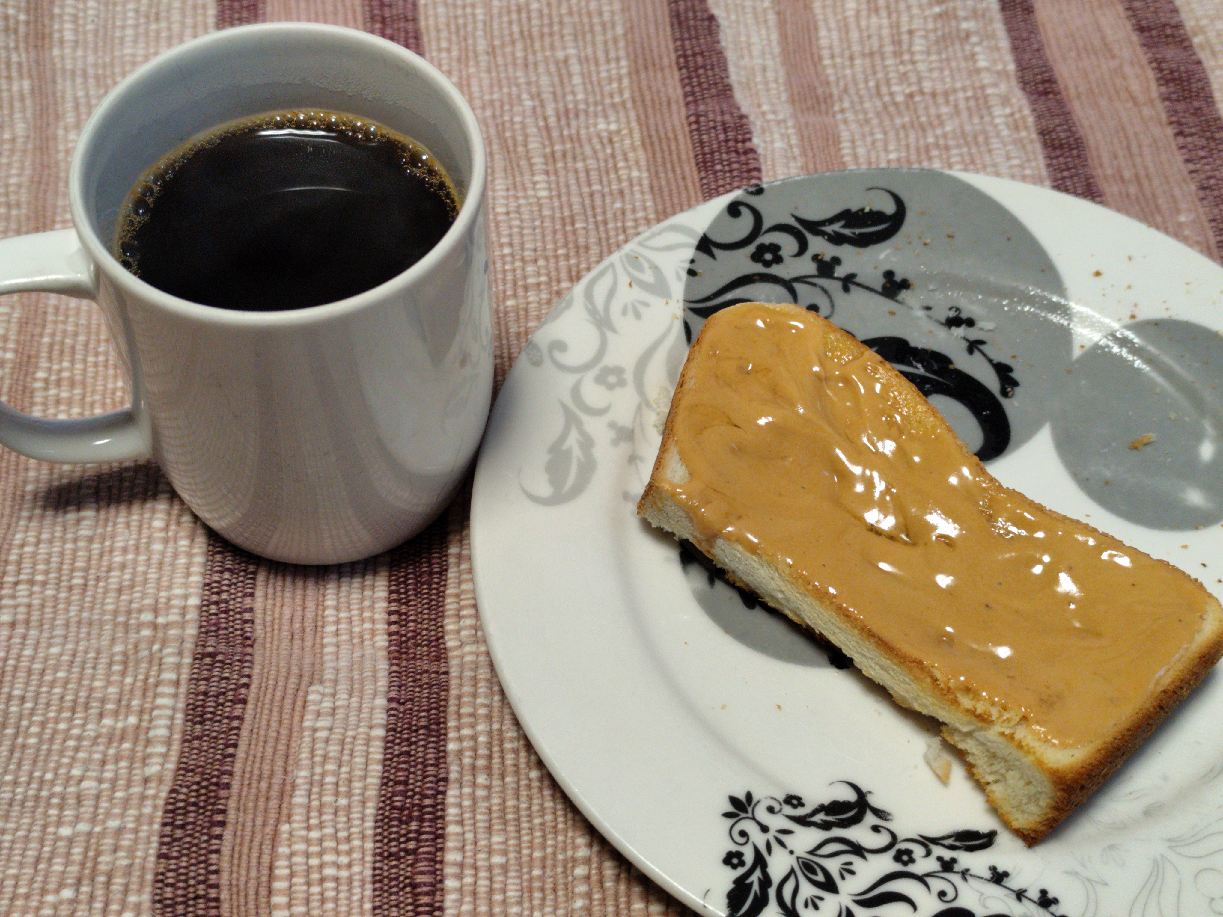 今日の朝ごはんはピーナッツバターパンとコーヒー
