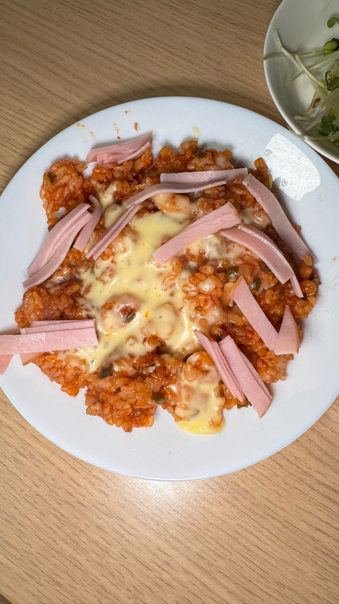昨日のオムライスでのチキンライスが残ってたのでチーズとハムをのせてみた。