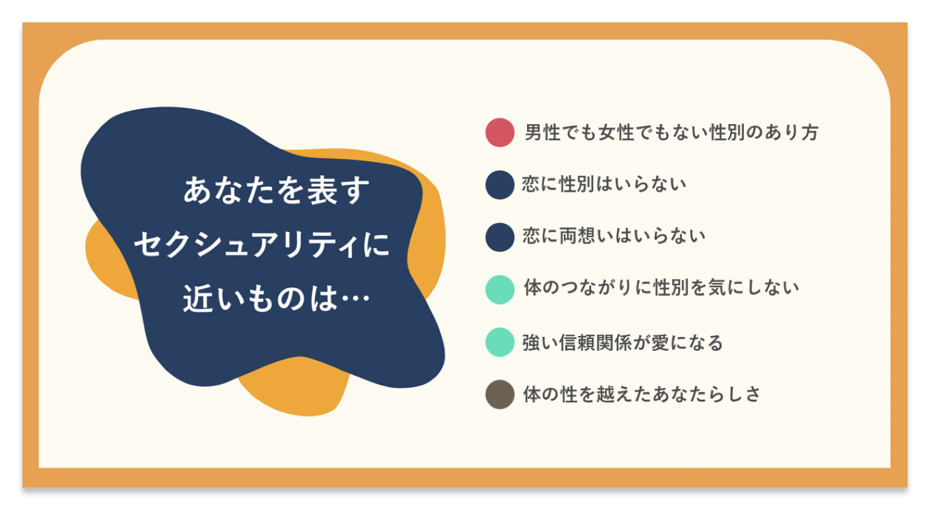アロマンティックだと思ってたし、結果を見た上でまだ自分の認識が変わってないからデミロマンティックという診断は正直ピンとこない。でもそれ以外は概ねその通りな気がする。
