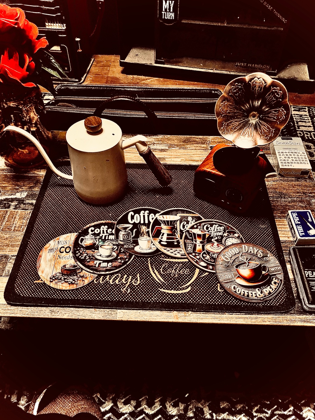 珈琲ドリップポットと各種コースターを