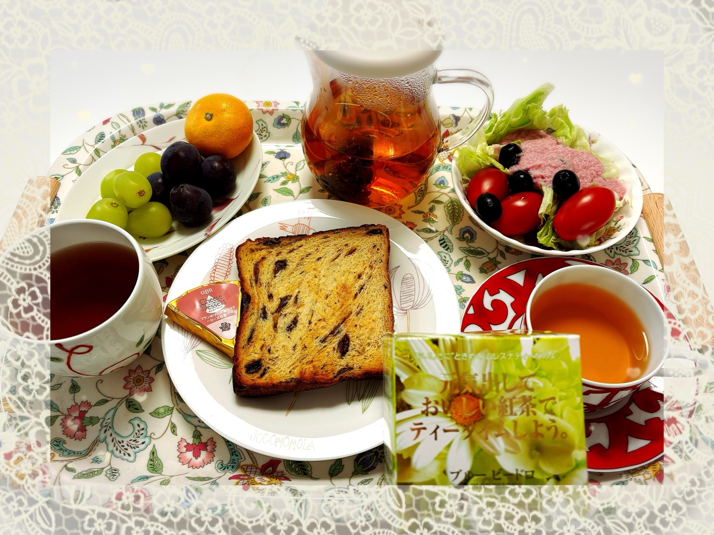 本日は、かむほどに美味しいぶどうパン、#QBB デザートチーズ、アイコ、キノコのポタージュ、#ムレスナティー プレミアムグイハオです。