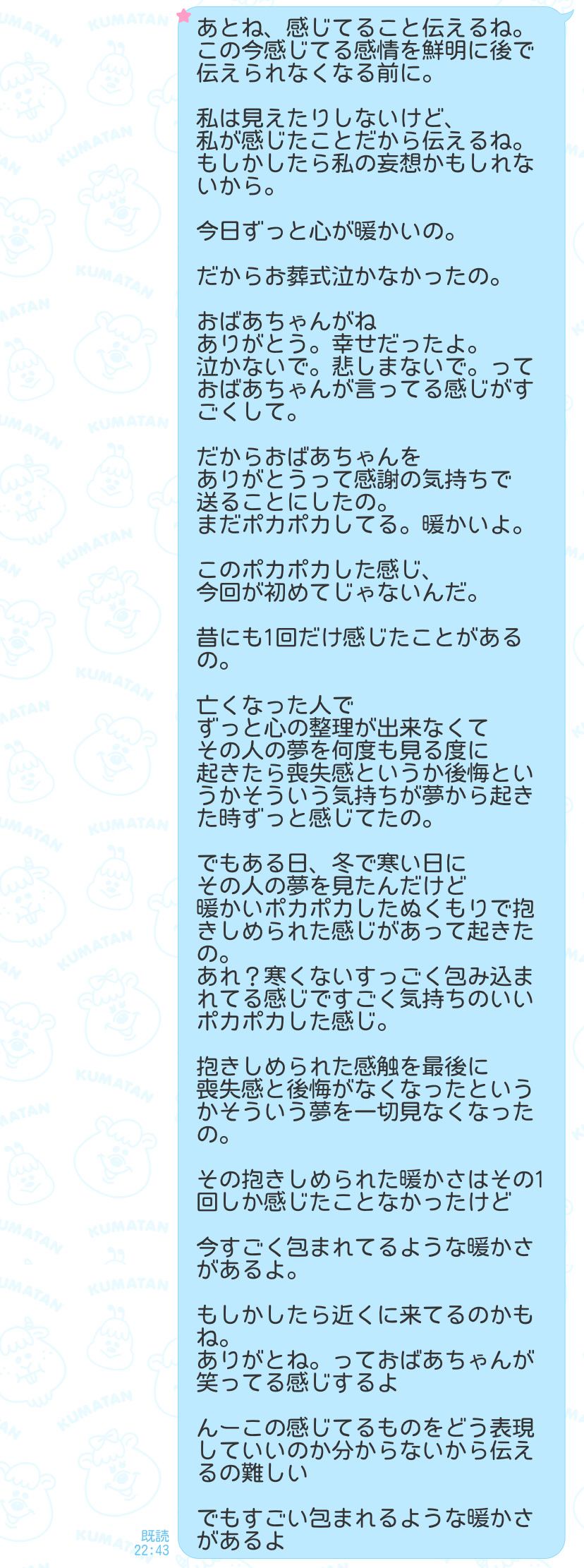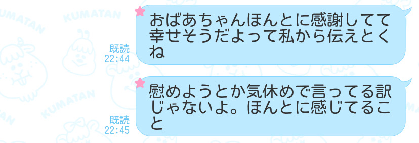きっと天国にいる空間かおばあちゃんの幸せが伝わったオーラなのかなって思ってる。