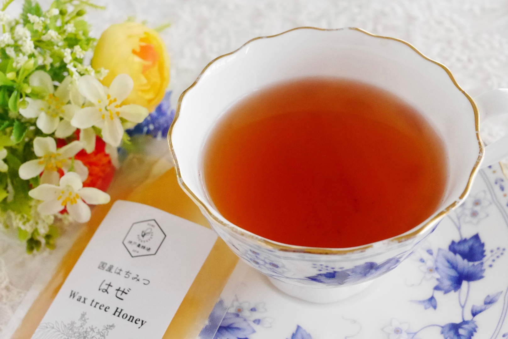 ジンジャーティー🫖にハチミツ🍯を入れて飲みます。「はぜ」のハツミツは薄い琥珀色でキレイな色。味は爽やかでマイルドなのが特徴で、煮物にも合うそうです。