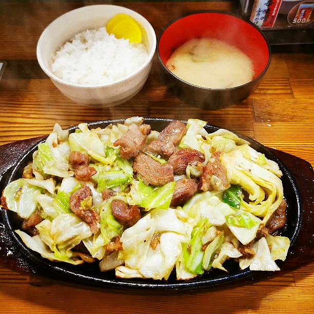 金曜日お疲れ様でした〜🎵せっかくグルメで紹介されたお店へ行ってきました。ニンニクの効いた豚肉とキャベツでごはんが進みました。鉄板を傾けて端にたまった汁に辛味噌を溶いて食べるスタイルが定番みたいです。