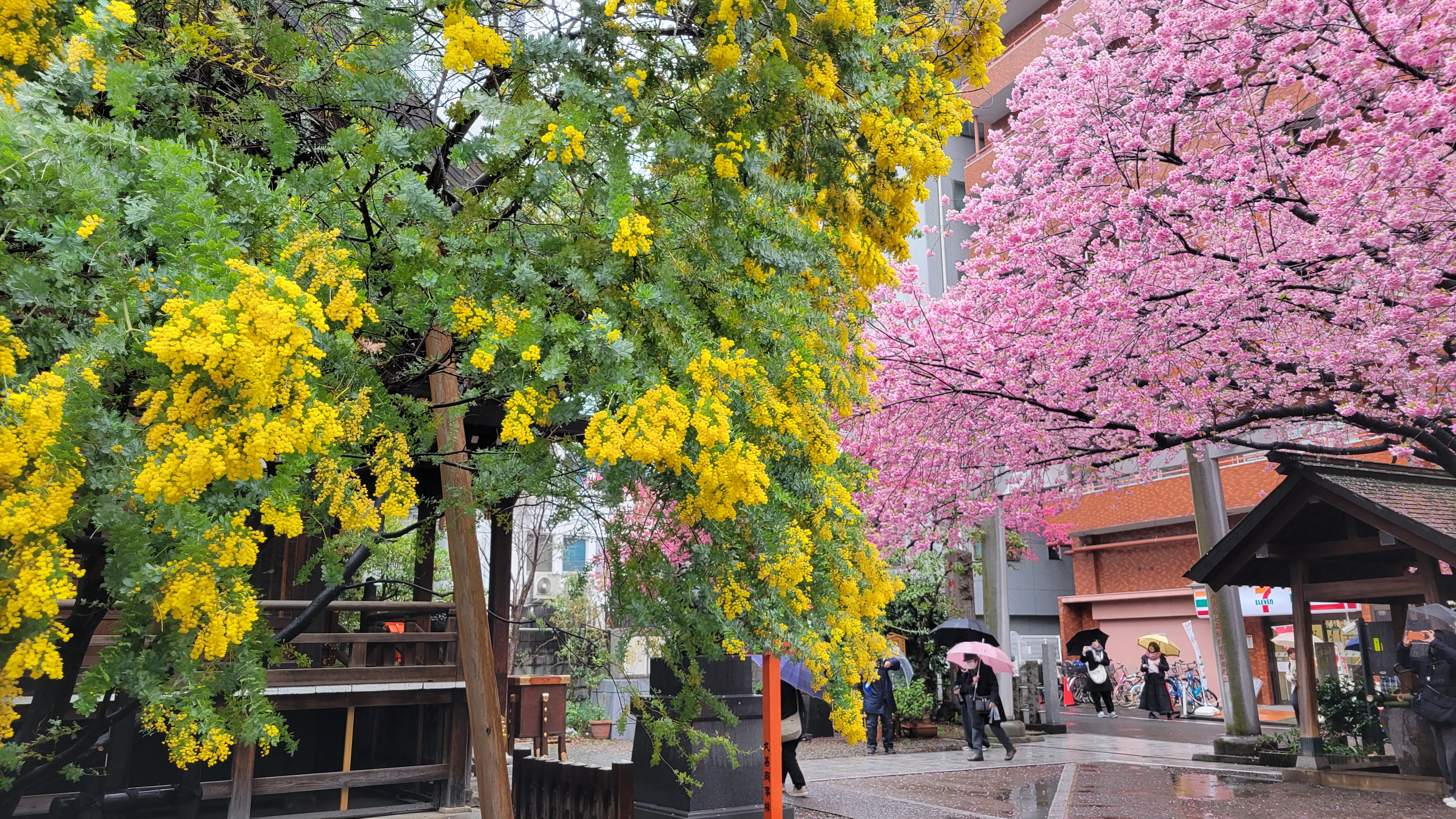 蔵前神社にはミモザと河津桜が同時に楽しめて黄色とピンクで綺麗なので毎年混雑する場所です