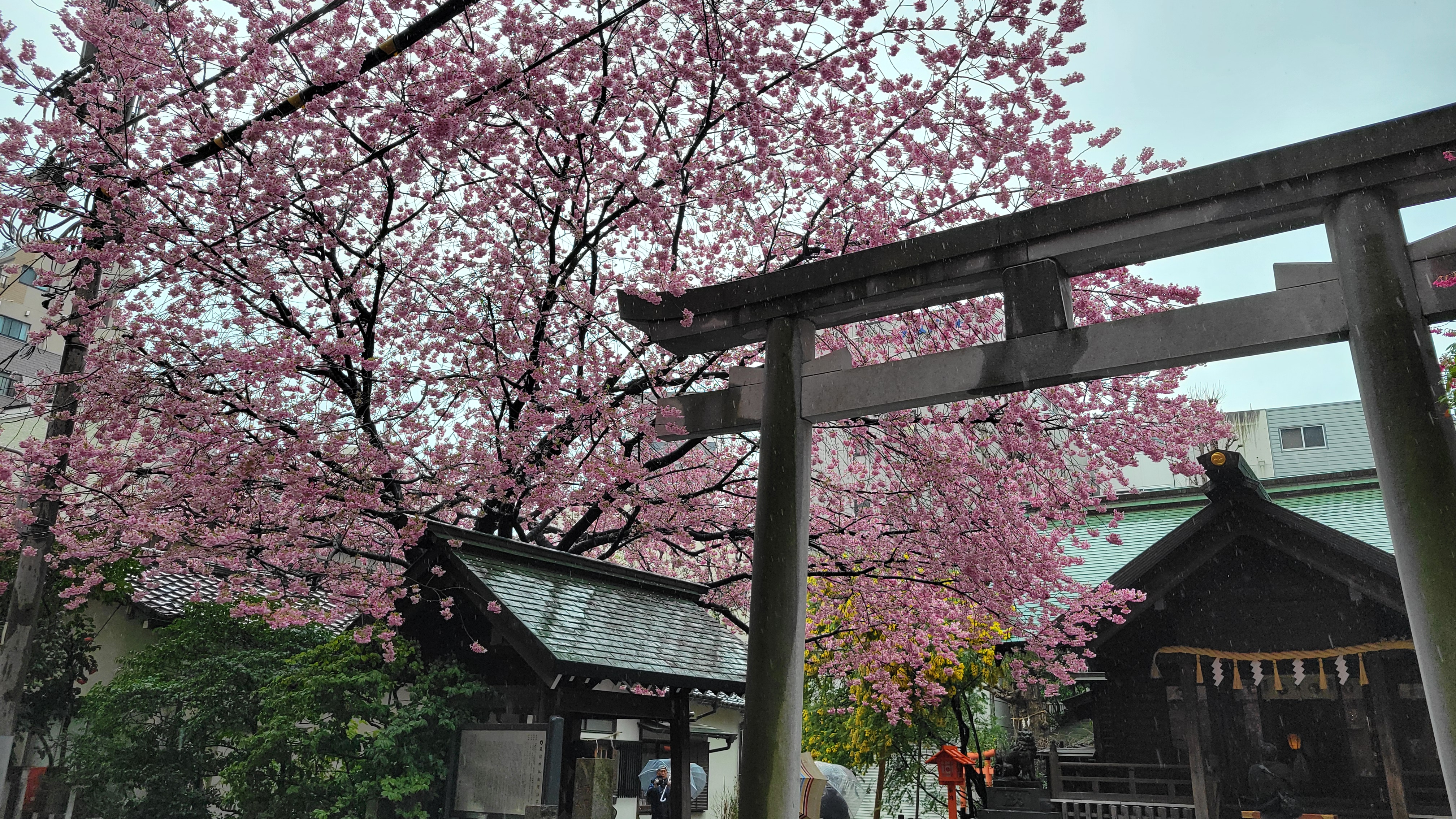 ミモザの黄色と河津桜と寒緋桜のピンク。そして椿の赤。雨のお陰で、参拝の方も少なく、ゆっくりとお花の鑑賞が出来ました。