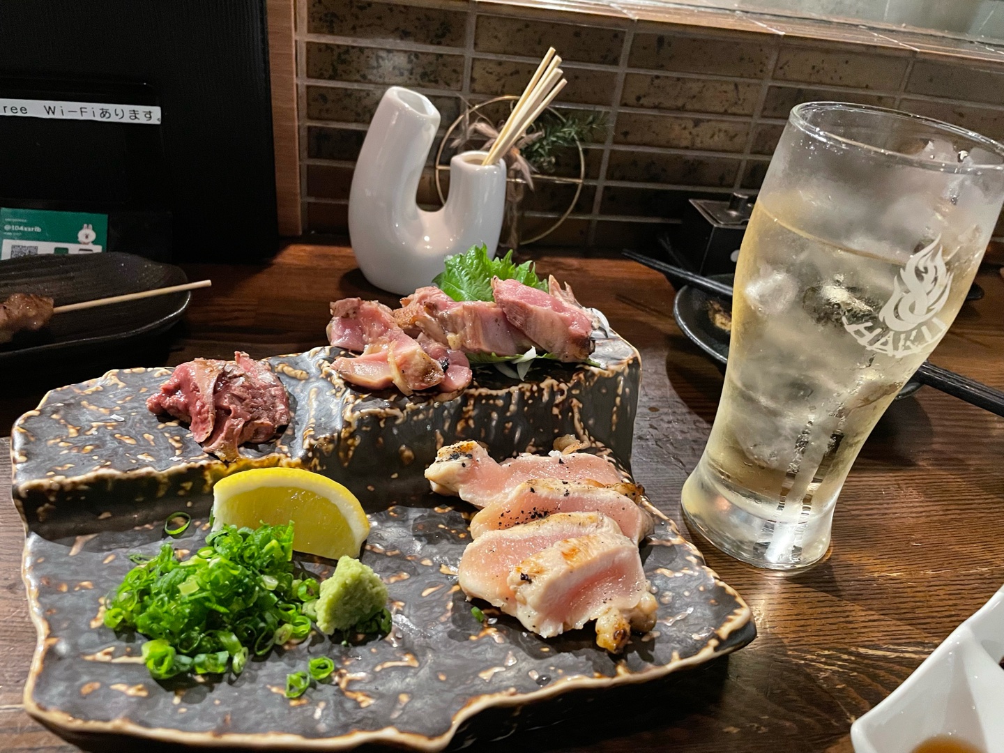 関サバ関アジを入れてもらった刺し盛りに、鶏天、琉球、鶏の叩き、海鮮オムレツ。