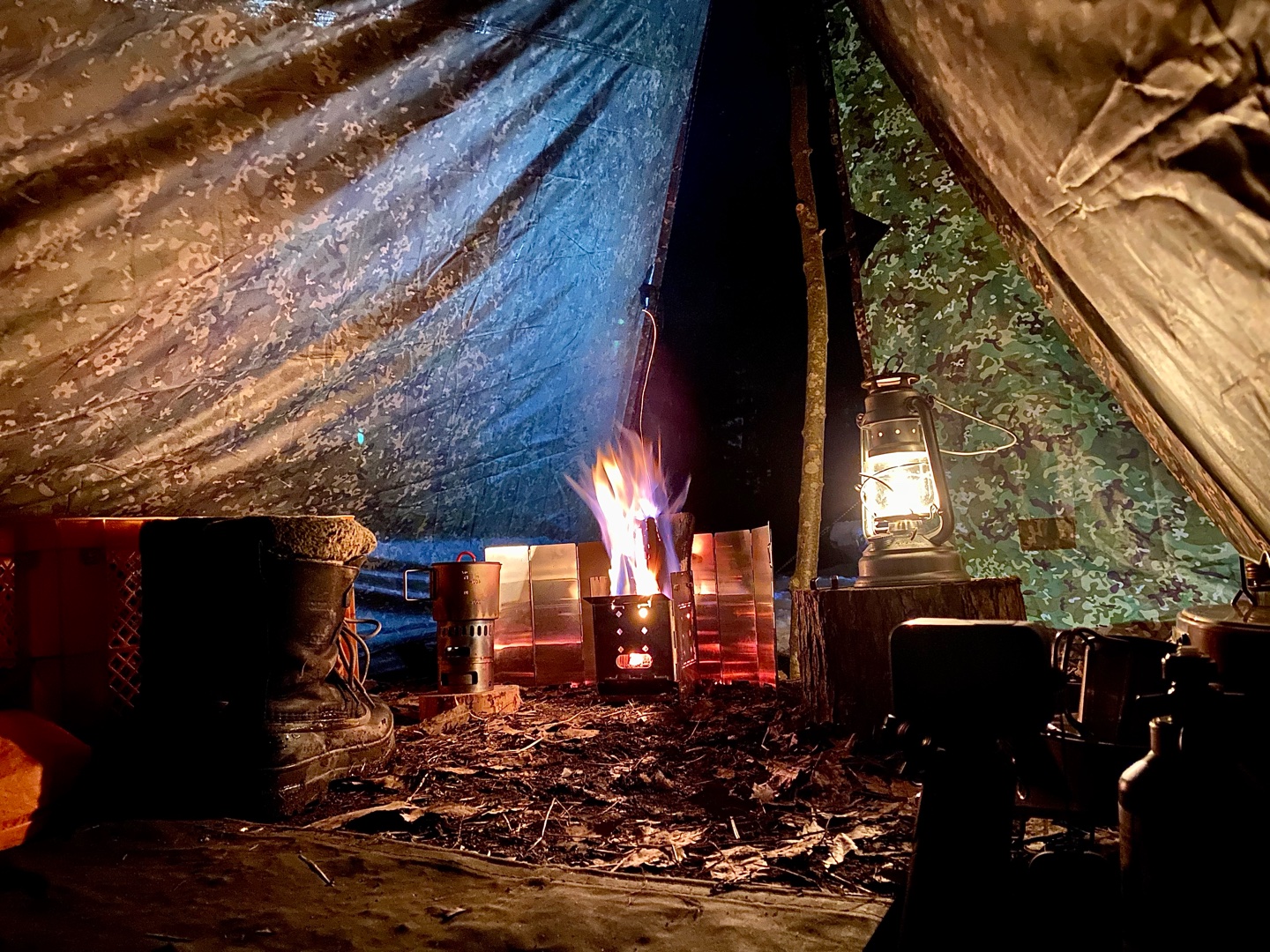 ポーランド軍幕にタープとして東ドイツ軍幕を使用。冬キャンプで初めて薪ストーブをインストールしてみた。薪ストーブ。なかなか良い感じ。