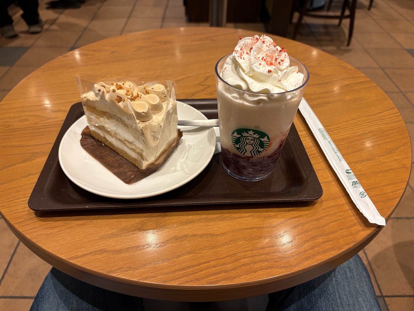 ホワイトモカケーキと期間限定のフラペチーノ(´∀`)クッキーくんは売り切れだった(゚ω゚)