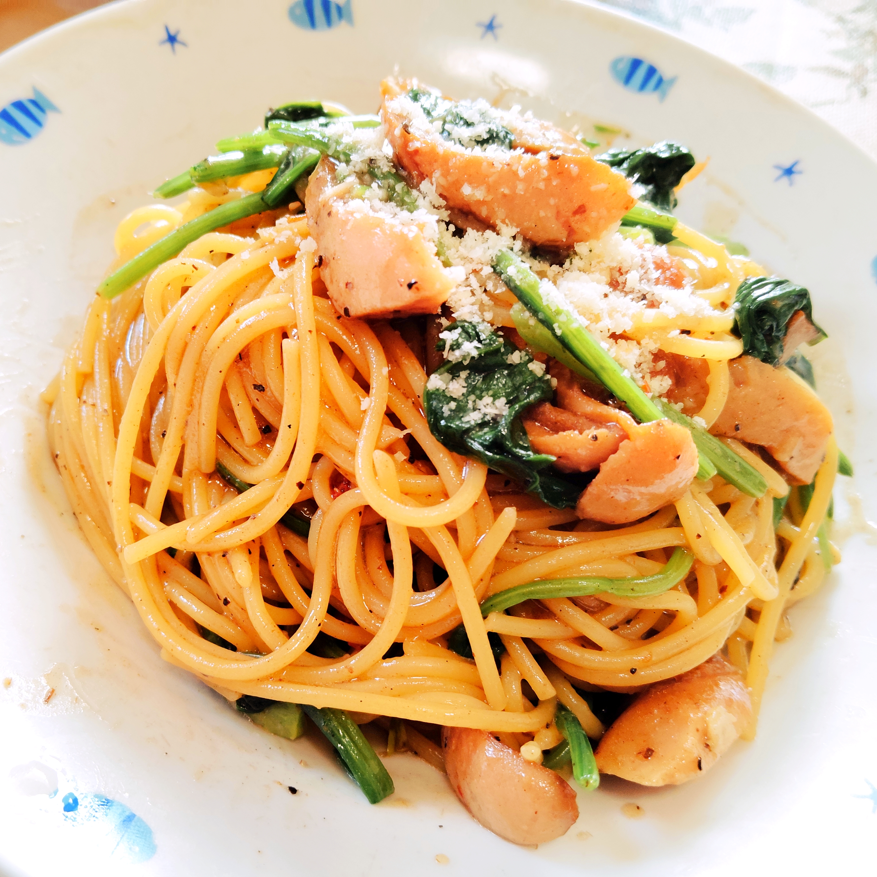 マキシマムでソーセージとほうれん草のワンパンパスタ作った[照れる]