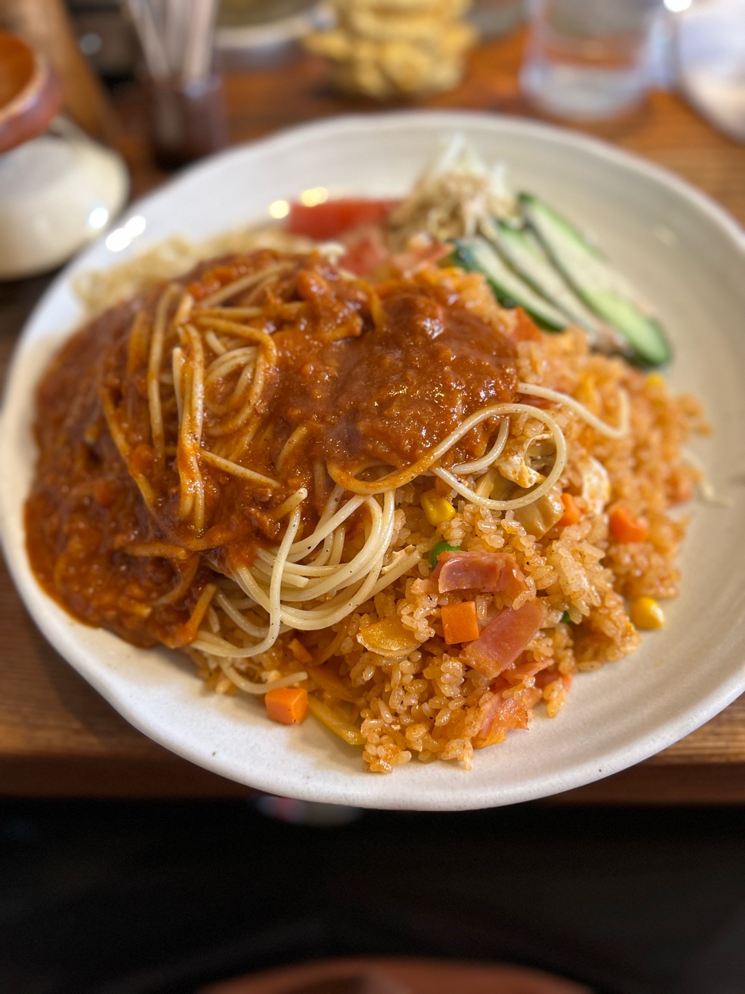 昼はデカ盛り食べたくてデカ盛りの聖地?リバーサイド🍝🍚色々な組み合わせがあって迷いました!メニュー名もユニーク😂