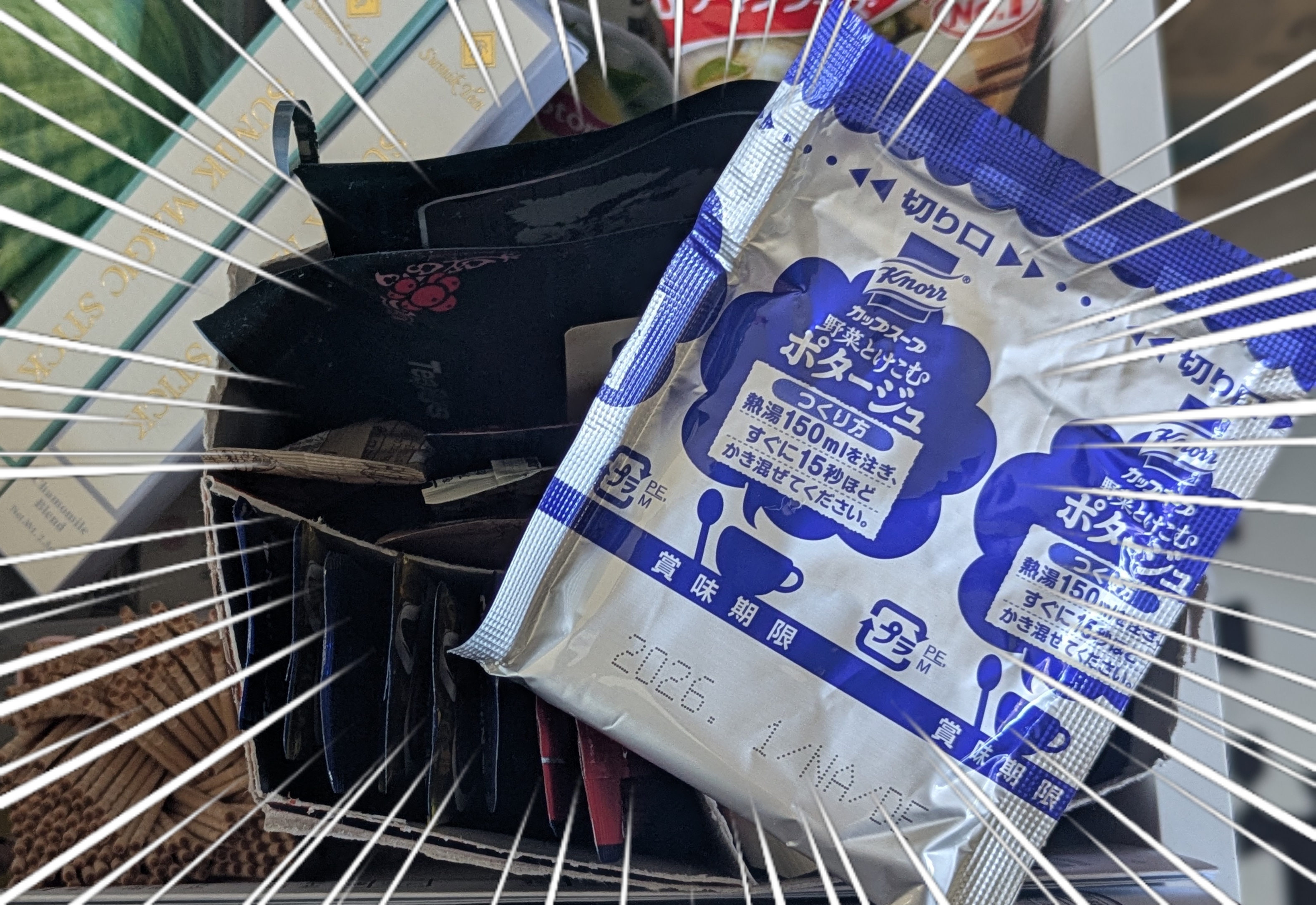 たった今、ドリップコーヒーの袋5個あるーって思ってケトルでお湯沸かして、袋取り出したらポタージューーーーーーガー(꒪д꒪)ーン