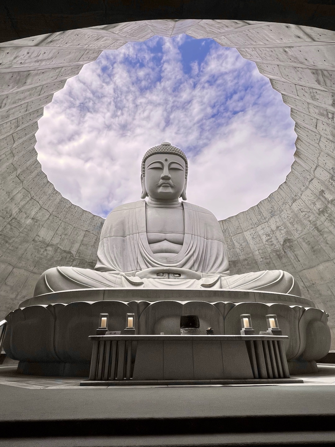 建築家の安藤忠雄さんが設計した大仏殿に鎮座しています。ドーム状の屋根の真ん中に空いた穴から頭だけつき出して見えるから「頭大仏」らしいです[照れる]
