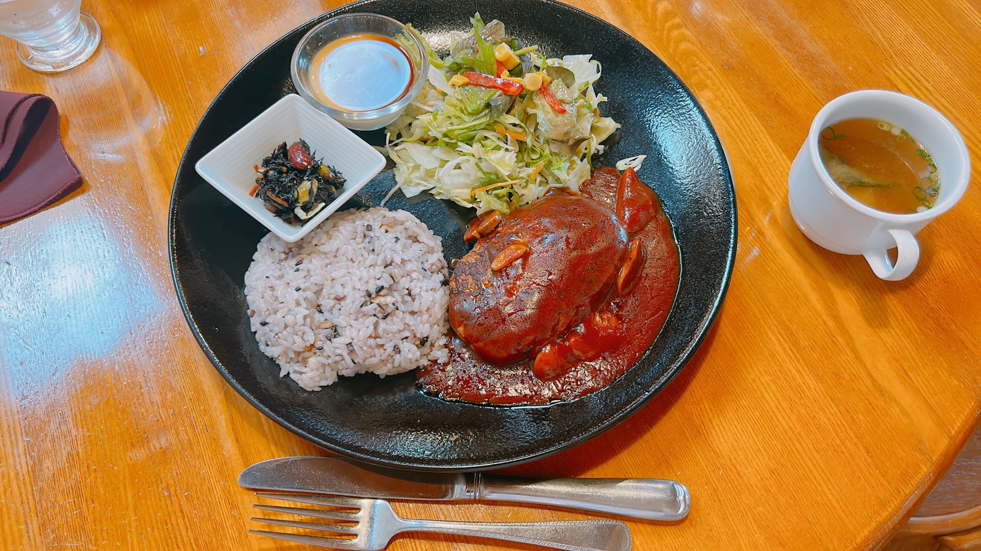 お昼にランチプレートのデミグラスハンバーグ食べて