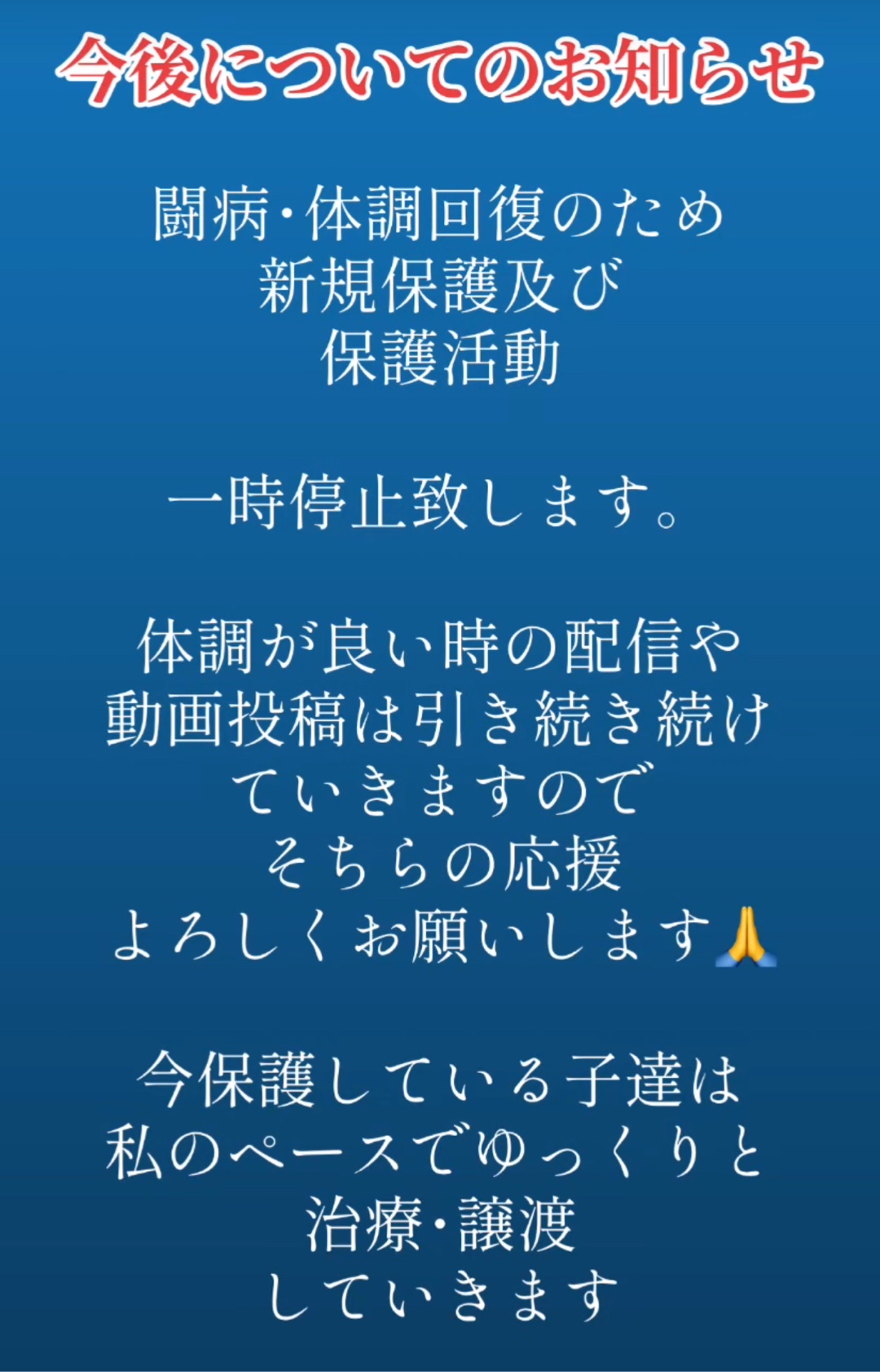 保護活動一時停止し自分の治療に専念するべきだと思ったため保護活動一時停止させていただきます。
