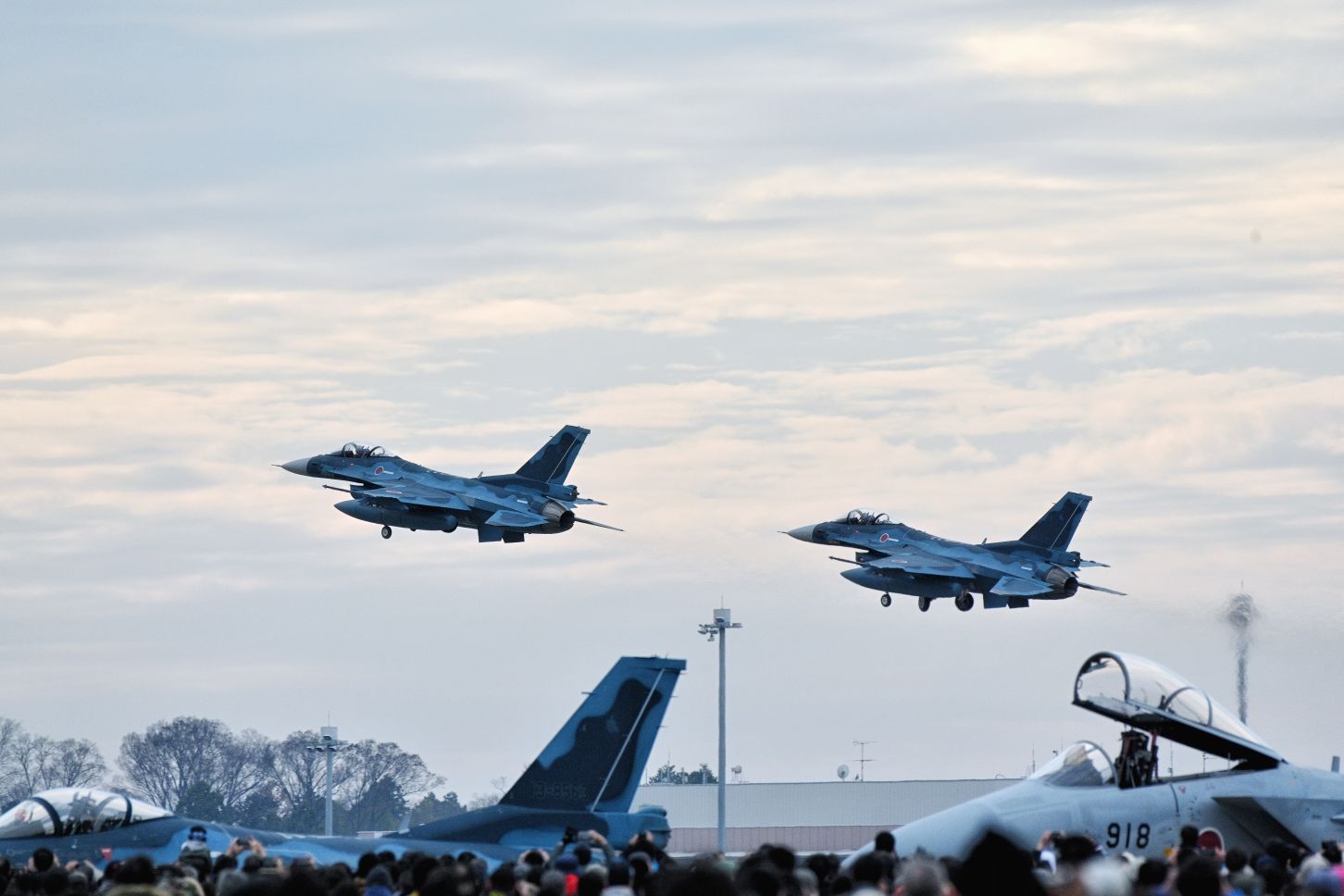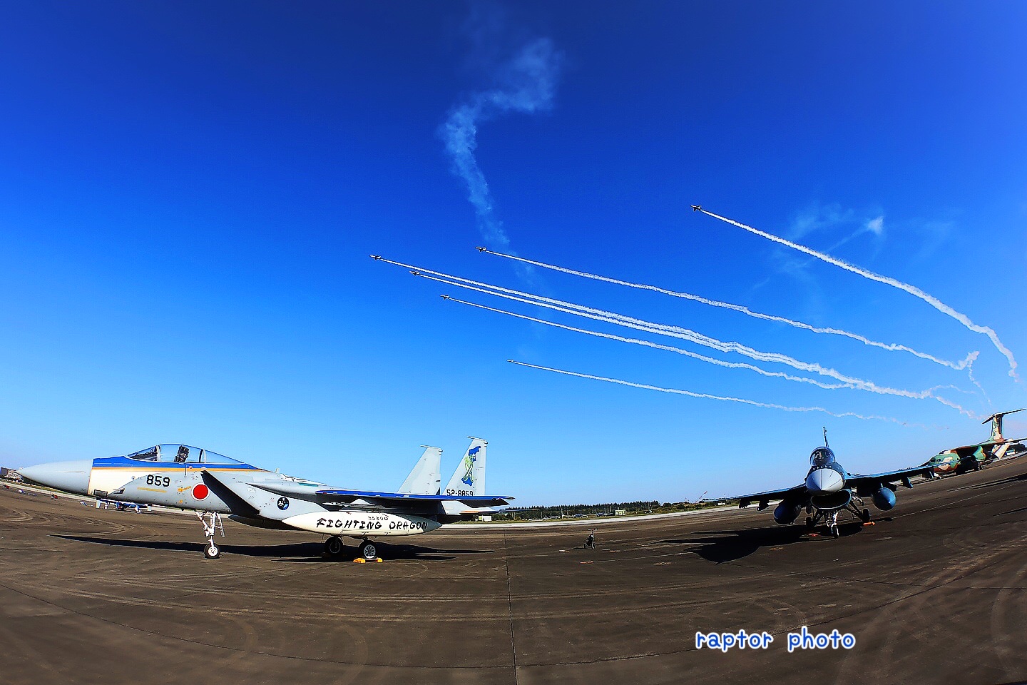 F-2とF-15の後ろを舞うブルー、眼福[目がハート]早起きした甲斐があったよ。