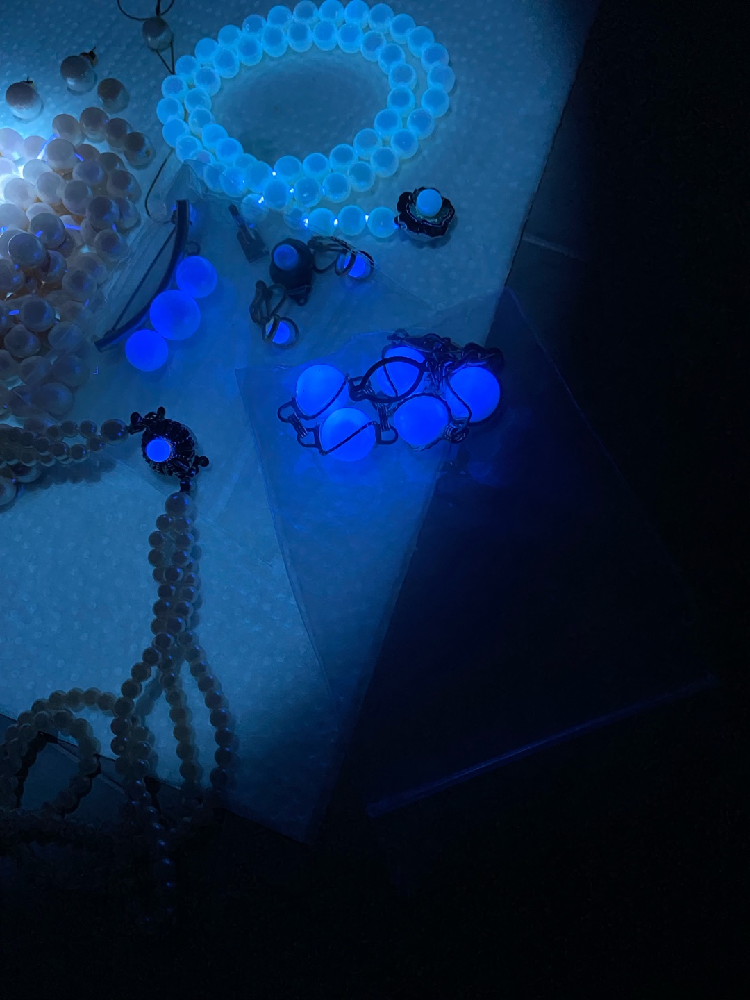 ちなみに、画像内の青白く光っているパールは安物です。