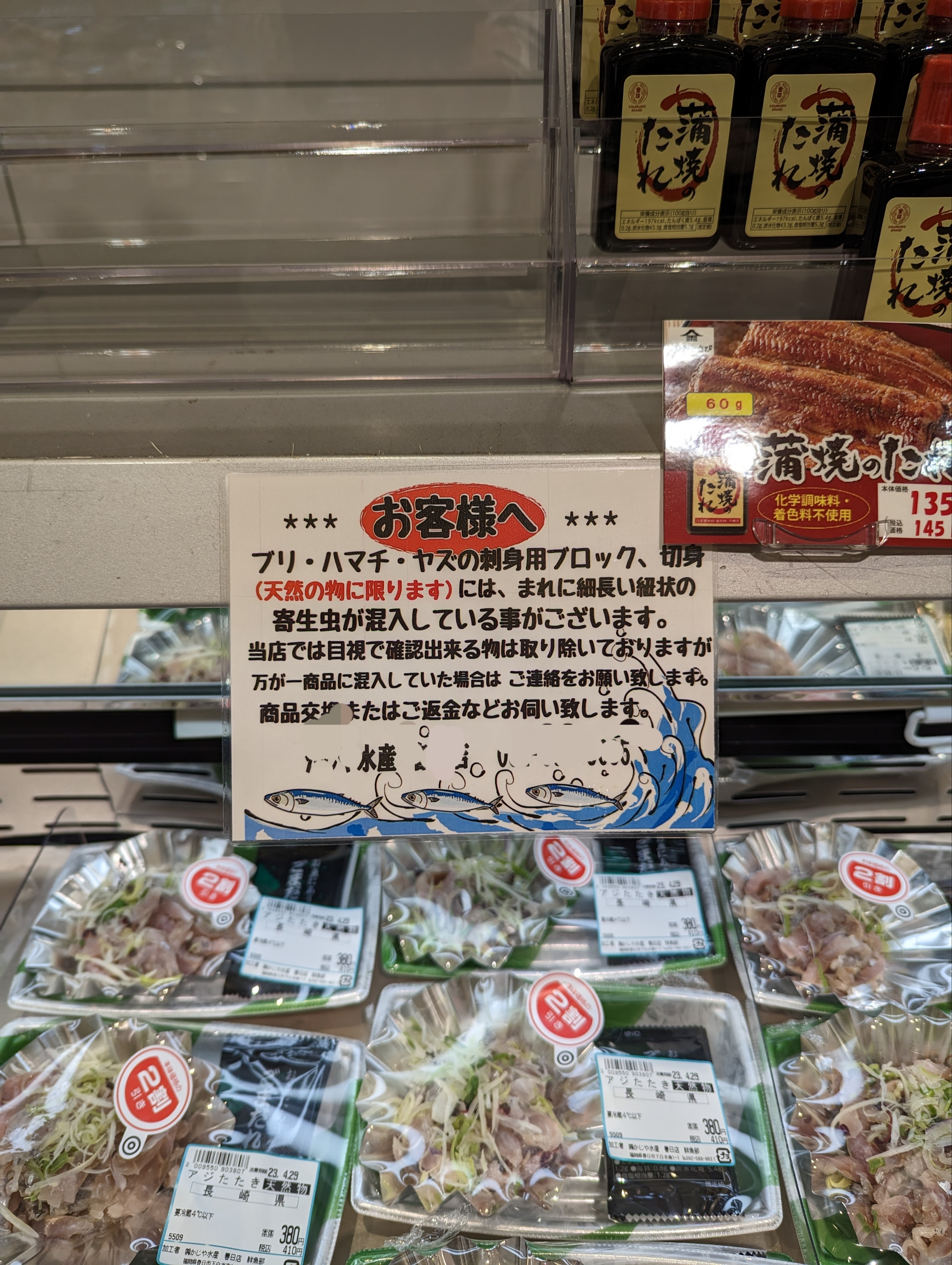 #アニサキス #寄生虫 #当たる スーパーに行くと鮮魚コーナーに有った注意書きが目に止まりました。 やはり、寄生虫は稀にいて、お店でも見逃してしまう可能性があるのだと言う事です。 西日本、特に九州では天然の魚の刺し身は普通に食べます。 鯖、鯵、鰹などスーパーでもよく見かけるごく普通の商品です。 しかしながら、アニサキス等の寄生虫がいることも知っていますが、そんなの気にせず食べています。 関東圏の方だと鯖の刺し身は、中々食べないし出しているお店も少ないと聞きました。 やはり、アニサキス等の寄生虫が太平洋側で捕れた魚には多いと聞きます。 九州近海で穫れる魚は比較的アニサキス等の寄生虫が少ないので、「当たる確率」が低いようですが、たまに当たったと聞きます。 まぁ、そんなの気にしてたら美味しいお魚は一生食べられません。 なので、私は普通に食べます。🐟