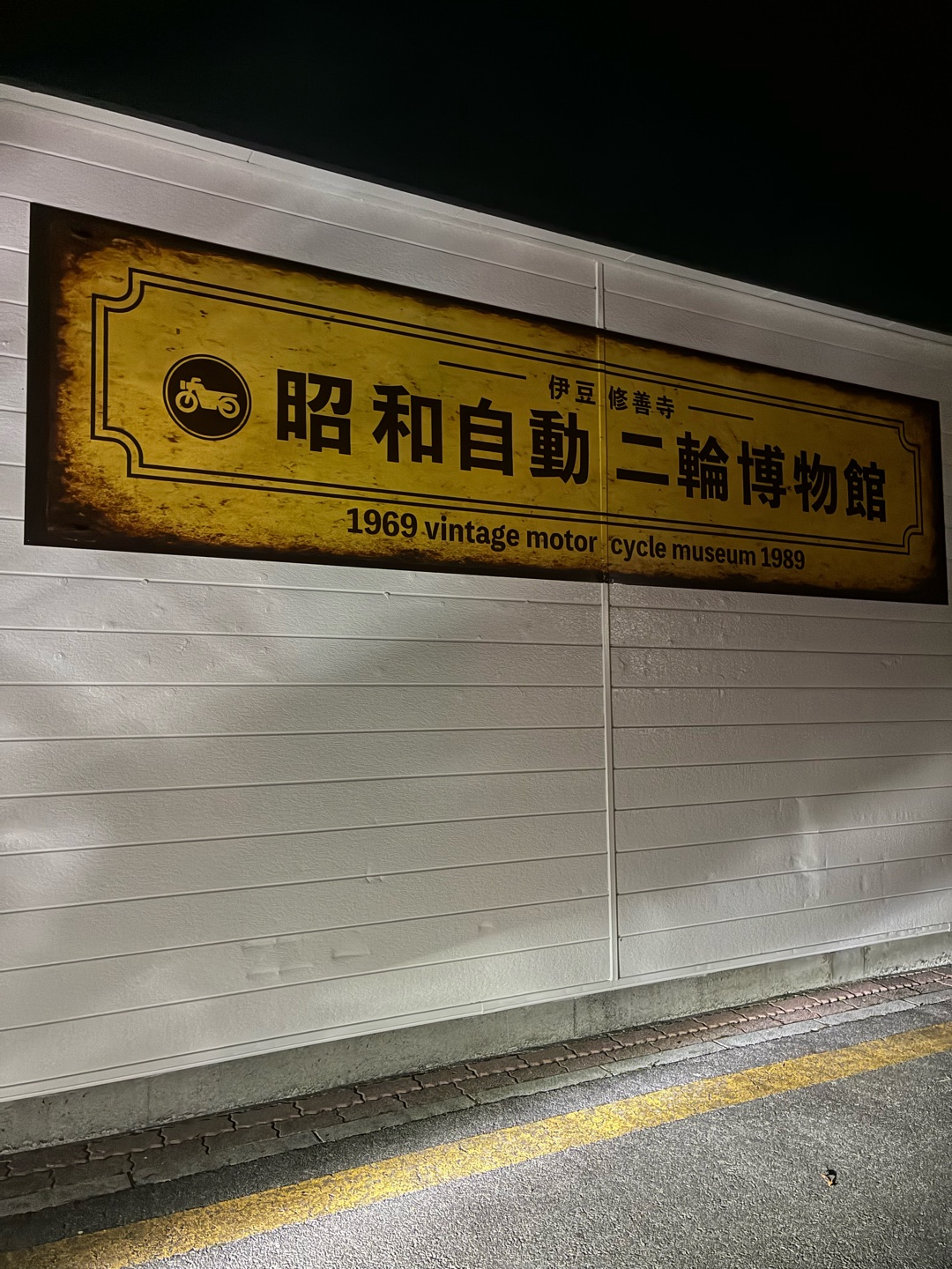 修善寺に出来た昭和自動二輪博物館 仕事終わって走りに行った途中で寄ったけど もちろん開館時間過ぎてる 真っ暗でバイクのライトで何とか看板だけ撮れた 入館料高いけど一度は行ってみようかな #バイク #修善寺 #旧車 #族車寄りなのがちょっと