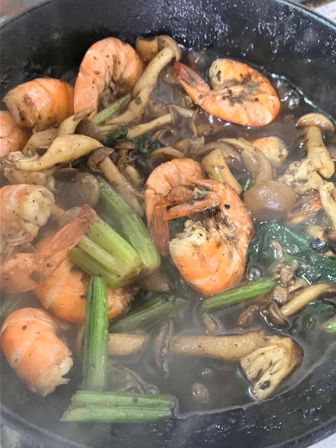 •エビとブナシメジとほうれん草のバジル炒め