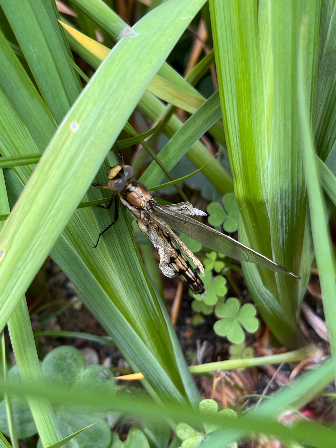 #GRAVITY日記 #命#トンボ #羽化 #失敗 写真は羽化に失敗したトンボ。 まだ、辛うじて生きてはいます。 今朝、蓮の葉の下に失敗した姿で固まっていたのを見つけたチビ達。 チビ達『羽、大丈夫? ちゃんと飛べるの??』 パパ 『もう、飛べないよ。餌も捕まえられないから死ぬのを待つだけか、逃げる事も出来ないから、食べられちゃうか。。。どうしたい?』 チビ達 『食べられないように隠してあげたい』 というわけで写真のように、鳥さんに見つからないように菖蒲の葉の間にひっそりと。 死を待つだけの姿を見て、自分達には何が出来るのか?何をしてあげたいのか…🤔💭 トンボの姿を借りて、少しだけ命のお勉強が出来ました。 自然からは、多くの事を学ばせてもらえますね[照れる] チビ達にとっては、良い命の教科書 ちょっとだけ、お兄ちゃんになってくれたかな[にこやか][大笑い]
