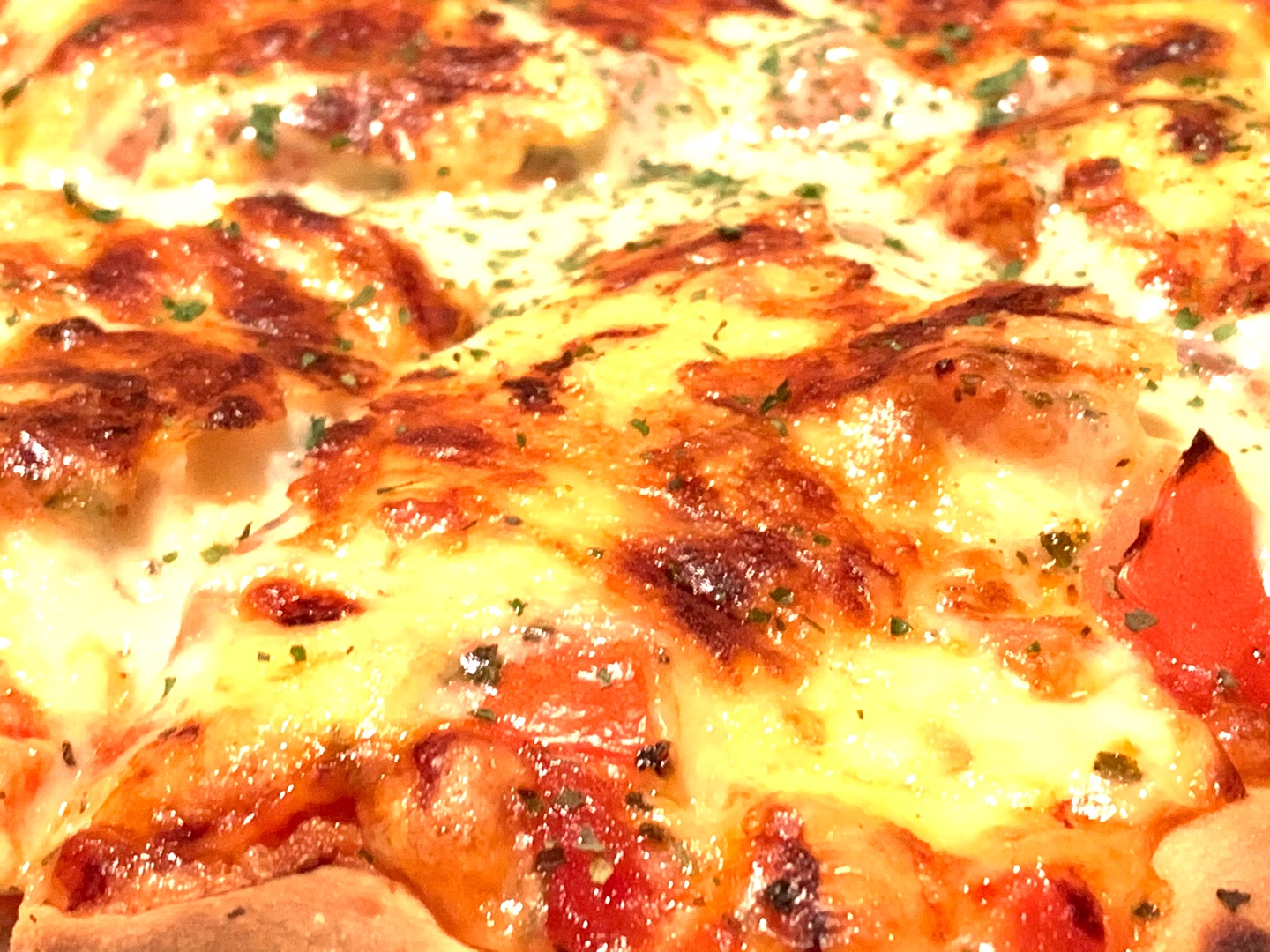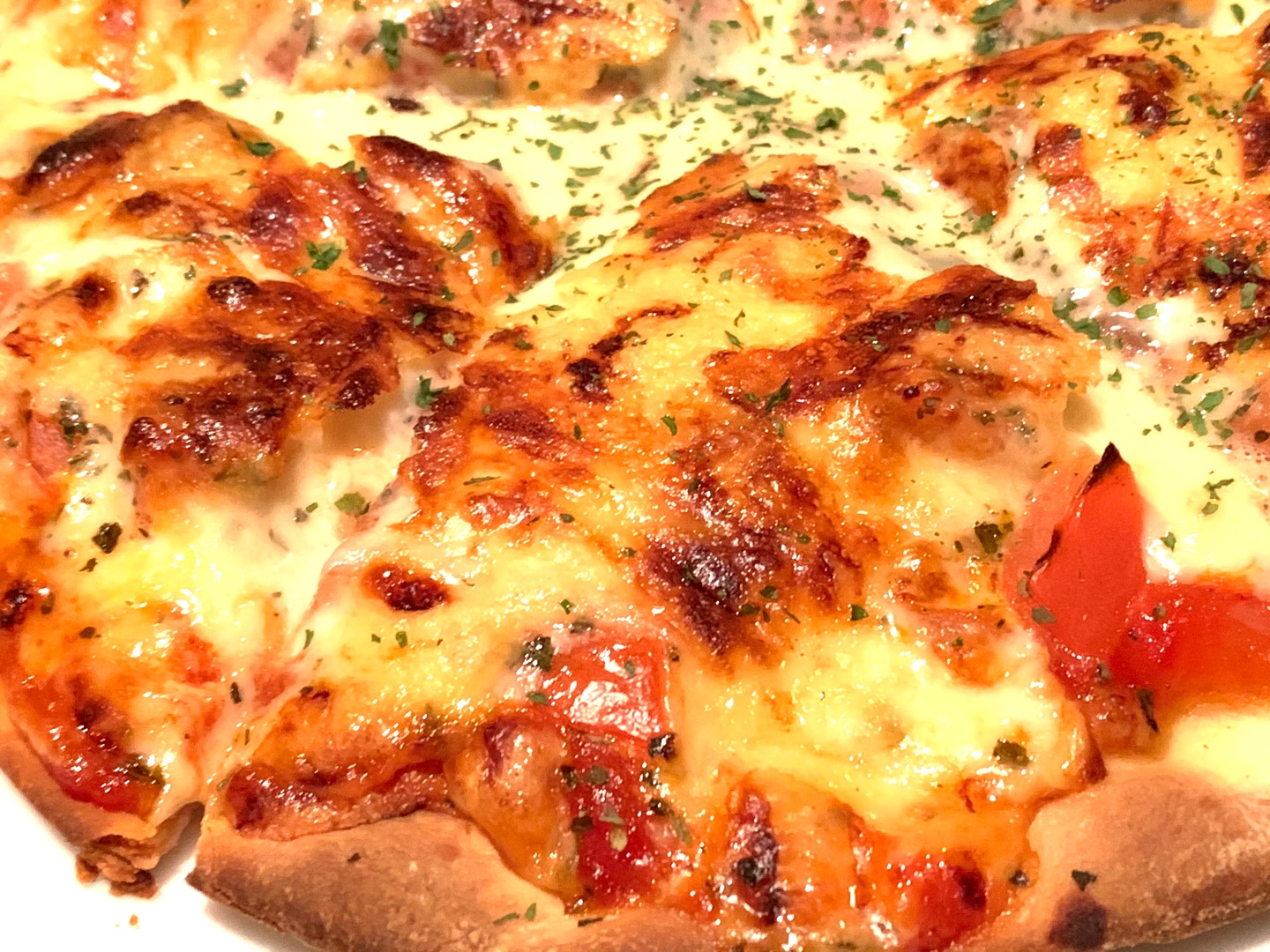 トマトとベーコンとチーズが焦げた匂いがたまりません。