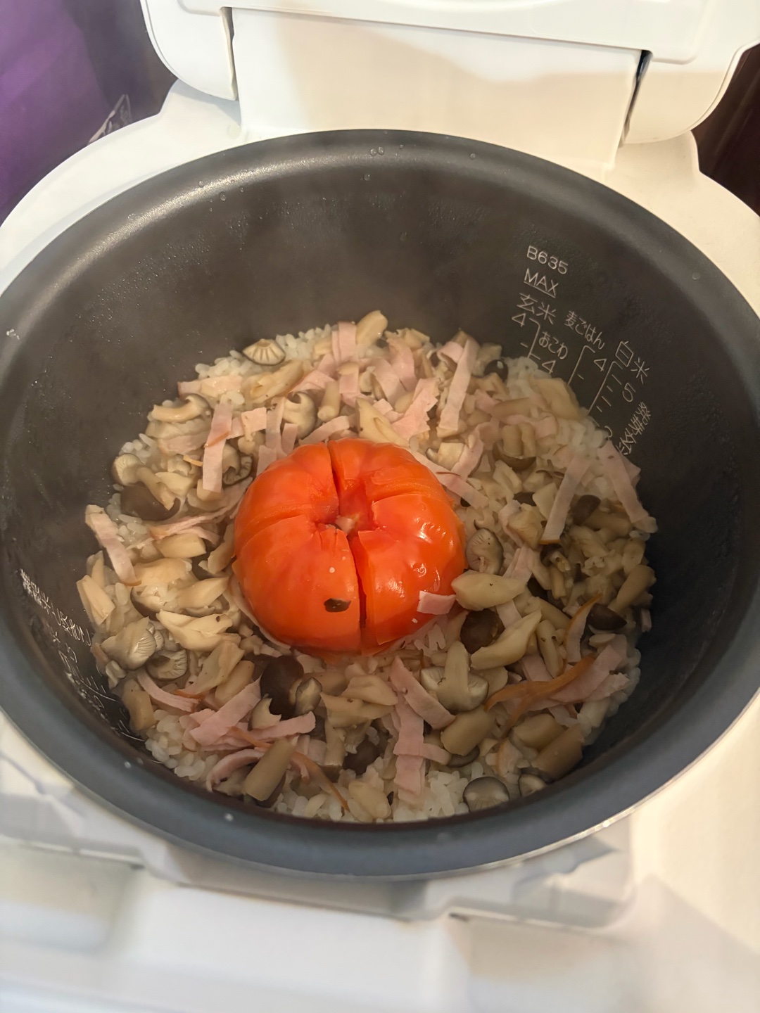 トマトとハムとキノコの炊き込みご飯✨