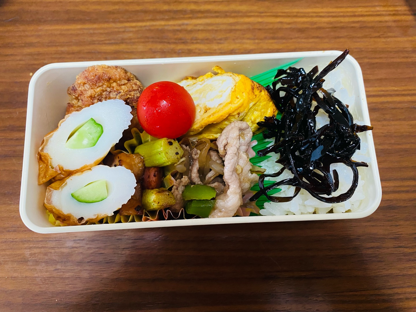 今日のお弁当✌️ #お弁当 #玉子焼き #肉野菜炒め #アスパラベーコン #からあげ